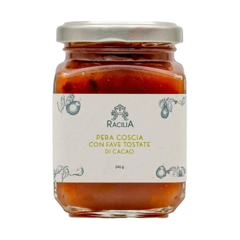 Une délicieuse fusion alliant la douceur des poires siciliennes à l'amertume du cacao et au croquant des fèves grillées. Confiture de poires Coscia aux fèves de cacao grillées Il est artisanal et sans gluten , plein de bienfaits, que vous pourrez déguster même sur une simple tranche de pain.