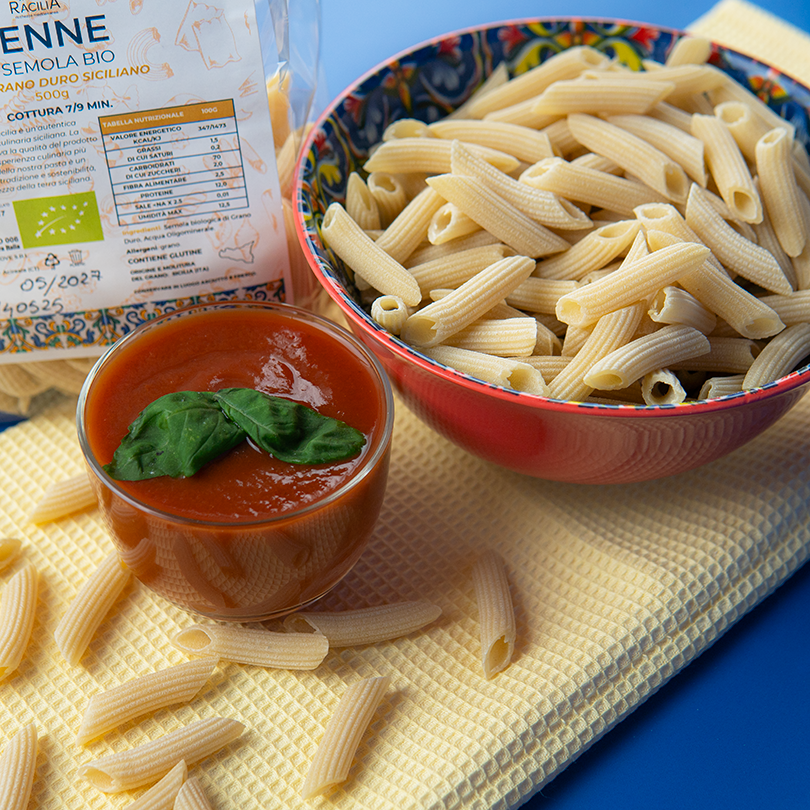 Les penne de blé siciliennes bio sont polyvalentes et toujours parfaites en cuisine. Leur forme fuselée et striée les rend idéales pour les pâtes aux sauces simples ou complexes, des classiques tomate-basilic aux plats aux légumes de saison, aux légumineuses ou aux sauces crémeuses. Elles conservent une cuisson al dente impeccable et subliment toutes les sauces grâce à la qualité de la semoule de blé dur sicilienne.