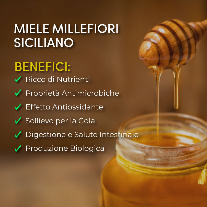 Notre miel de fleurs sauvages bio capture toute la douceur et la pureté de la nature intacte de l'île à chaque cuillerée. Obtenu exclusivement à partir de fleurs sauvages de la campagne sicilienne, ce miel possède une saveur riche et aromatique, idéale pour sublimer petits-déjeuners, tisanes, desserts et plats gastronomiques.